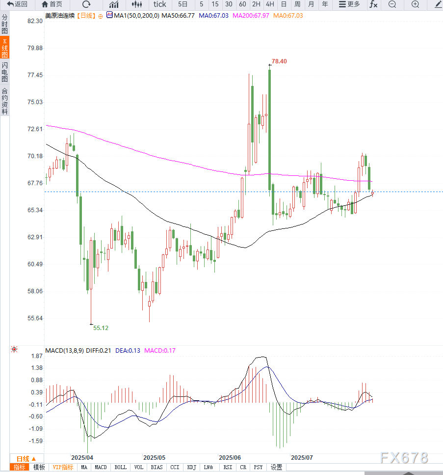 分析师普遍认为OPEC+后续增产空间有限。   据Goldman Sachs预测,因部分成员此前超产后需削减,OPEC+中真正能持续增产的国家有限。该行还指出,若非OPEC国家供应继续增加,OPEC+很可能在9月后维持产量不变。   RBC Capital Markets分析师Helima Croft表示:“OPEC+押注市场能吸收新增供应似乎奏效,尽管增加产量,油价仍未偏离关税危机前的水平太远。”   地缘政治和美方制裁加剧市场不确定性。   美国总统特朗普日前警告称,若俄罗斯不停止对乌克兰的军事行动,将对其原油买家征收100%次级关税。已有两艘载有俄罗斯原油的船只因受制裁影响,改道他国。据贸易数据显示,这可能对原油供应造成扰动。   尽管如此,两位印度政府消息人士向媒体透露,“印度将继续购买俄罗斯原油,不会屈服于美国的制裁威胁。”   美国经济数据疲软,引发对能源需求的深层忧虑。   上周五公布的美国就业增长数据不及预期,使得市场对经济放缓的担忧升温,原油需求预期也随之下降。与此同时,美国贸易代表Greer周日表示,最近对多个国家征收的新一轮关税将继续保留,谈判中不会轻易削减。   从技术面来看,美原油(WTI)日线图显示价格跌破关键支撑位70美元,延续短期下行通道。当前K线连续两日收阴,MACD快慢线呈死叉发散,显示空头力量主导市场;   RSI指标位于40下方,处于弱势区间,尚未进入超卖,但动能不足。若价格持续维持在67美元下方,下一支撑将考验前低65美元区域;   反弹方面,70美元构成重要阻力,若无法重新站稳,将限制反弹空间,维持偏空结构。整体来看,WTI日线图技术面偏弱,后市仍有下探风险,需密切关注美元走势及OPEC+后续动态。