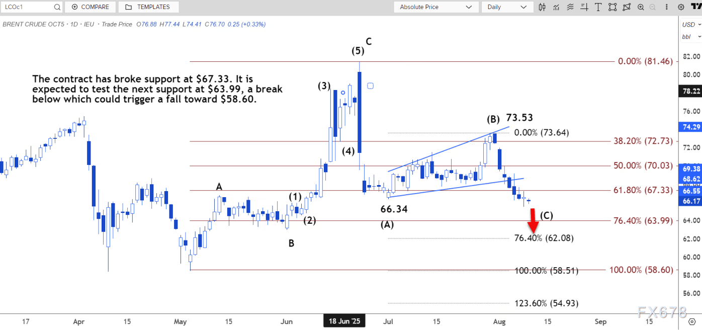 阻力位在66.91美元,突破该位可能推动价格上涨至67.78美元至69.20美元区间。日线图显示,该合约已突破67.33美元的支撑位。预计该合约将测试下一个支撑位63.99美元,跌破该支撑位可能引发跌向58.60美元的走势。