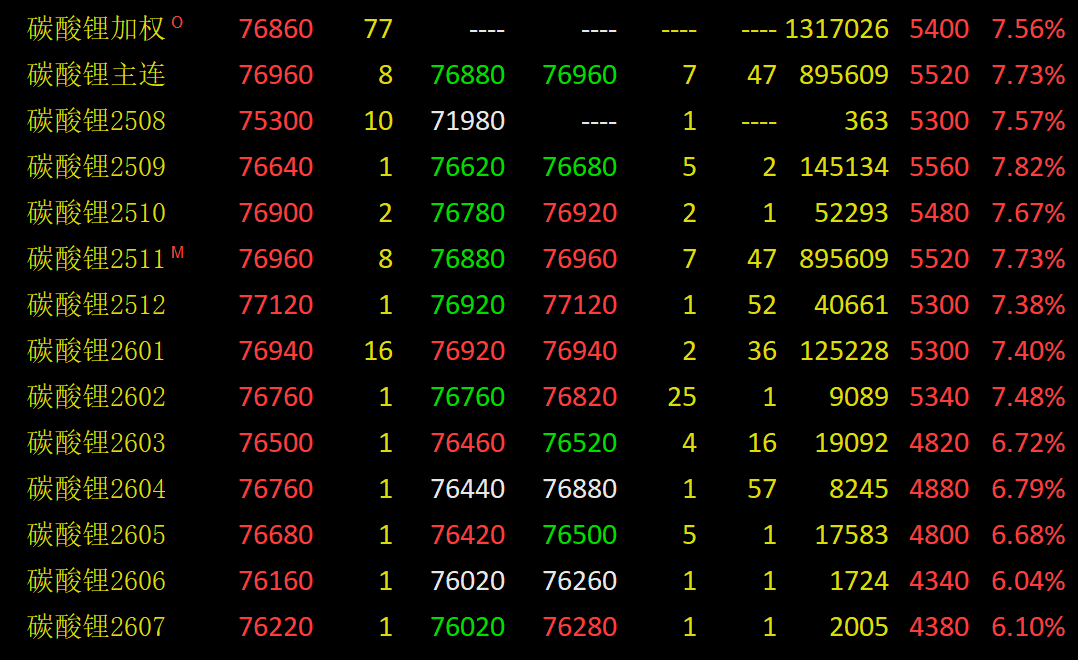 碳酸锂期货主力合约开盘涨停,报81000元/吨,成交额超17亿。    碳酸锂期货所有合约均...